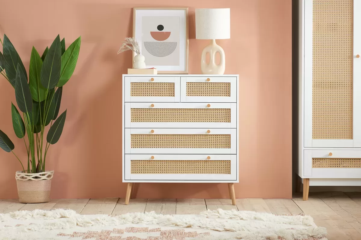 White 5 Drawer Rattan Chest