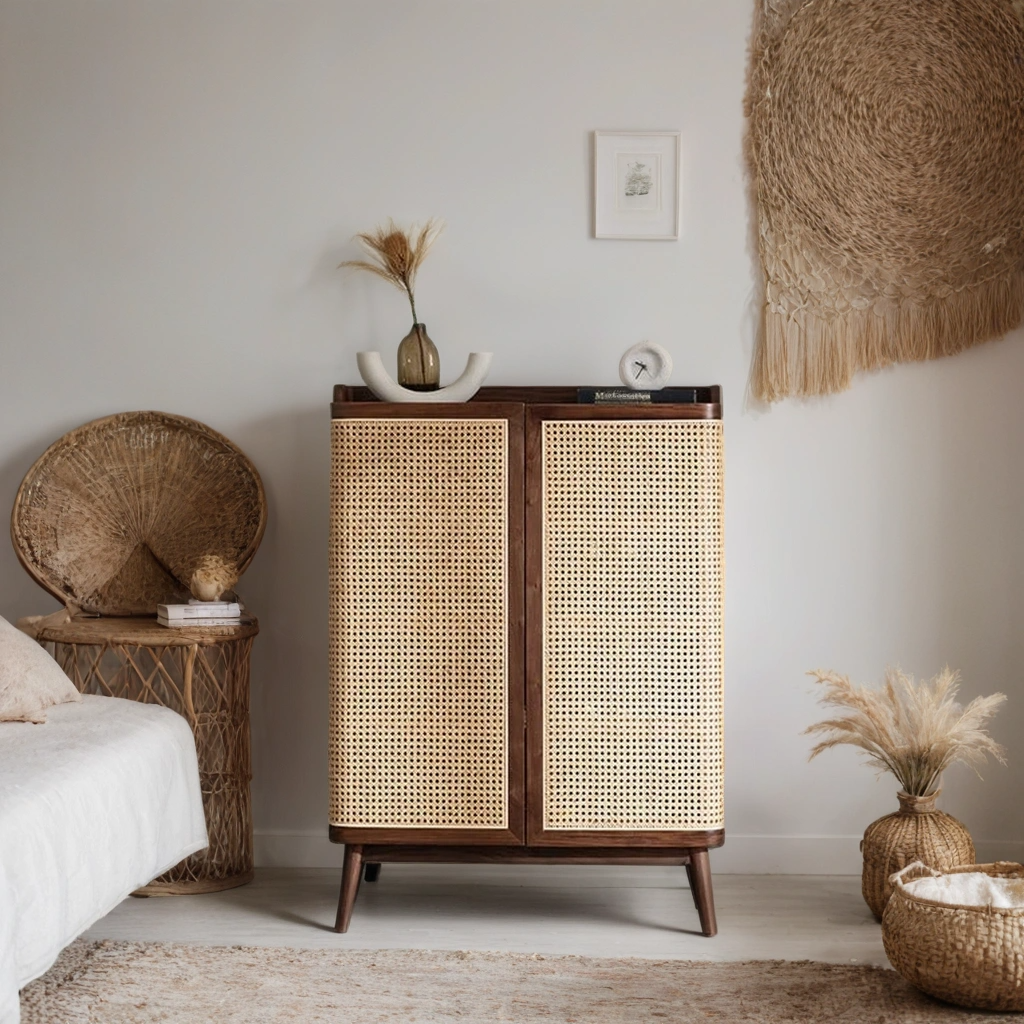 Rattan Wooden Cabinet Polished For Storage