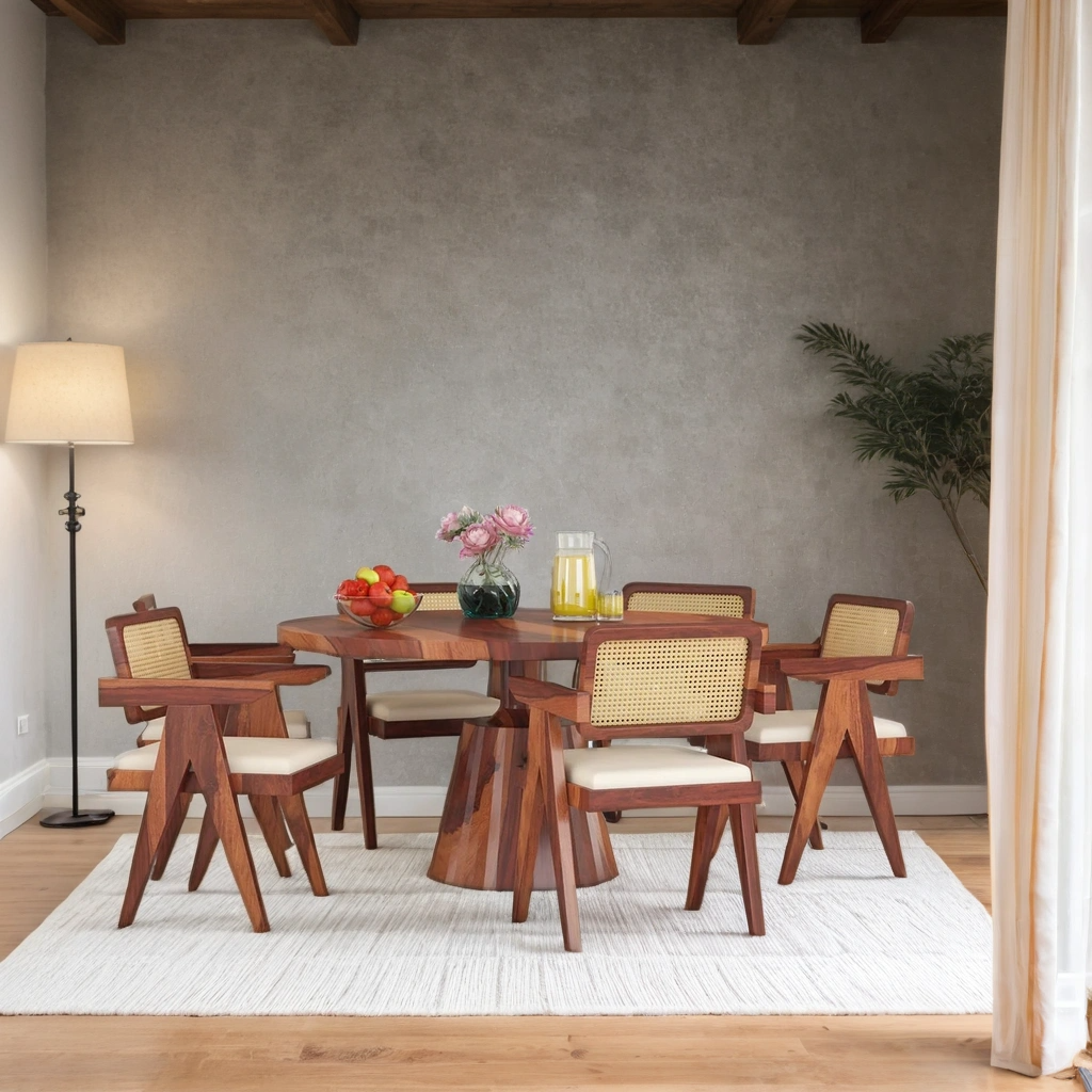 Wooden Round Dining Table With 6 Rattan Chair